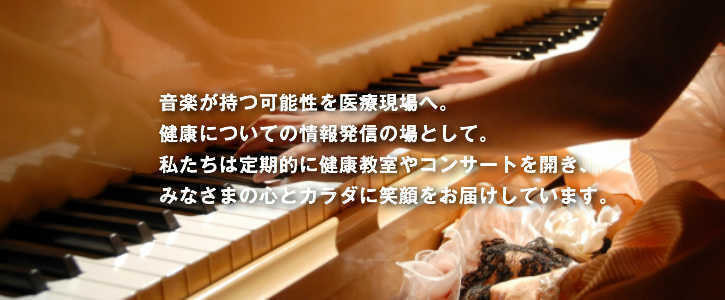 聴いているだけで、元気になったり癒されたり…。音楽が、私たちのこころに安らぎを与えてくれます。日頃の健康づくりの知識が、さらに日々の暮らしに安心を与えてくれます。私たちは県内外の音楽家を招き、クラシックのコンサートや様々な講師をお招きして健康教室を開催しています。当センターを利用される方だけでなく、どなたでも無料で受講や鑑賞ができ、地域のみなさまとの交流の場となっています。これからも「音楽」と「知識」と「健診」を医療と結びつけ、みなさまに笑顔を届けていきます。